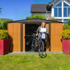 L’abri possède une façade de 370cm qui comprend une double porte coulissante pour un accès aisé et pratique lorsque vos mains sont encombrées ou que vous maniez une brouette. Le passage de porte est de 141cm pour une hauteur de 152cm. Avec une profondeur de 313cm et une hauteur faîtière de 185cm, vous pourrez y ranger confortablement votre outillage de jardin, brouette, tondeuse ou barbecue portable.