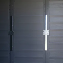La structure est renforcée au moyen de raccords métalliques reliant les panneaux entre eux. Les tôles gris anthracite des parois ont une texture imitant le bois et sont conçues pour résister durablement aux intempéries ainsi qu’à la corrosion, avec une garantie de 12 ans. La toiture peut supporter une charge de neige allant jusqu’à 100kg/m².