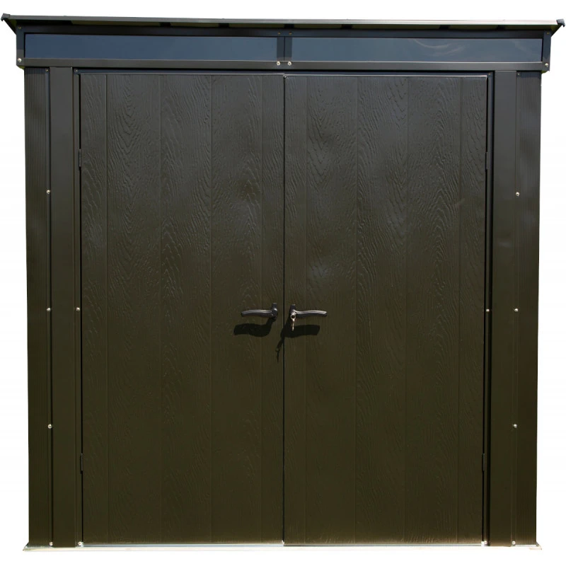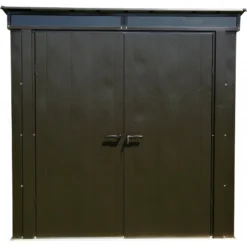 Ces panneaux qui constituent les parois et la toiture ne nécessitent aucun entretien, et leur coloris noir onyx s’intègrera discrètement et harmonieusement dans tout type d’aménagement extérieur. L’abri dispose d’une très large double porte battante, qui parcourt toute la façade, très pratique pour le transport d’objets volumineux. Chaque battant est muni d’une poignée, et une serrure à cylindre assure la sécurité de vos biens. La toiture peut supporter une charge de neige de 100kg/m², sa construction monopente garantit une évacuation efficace de l’eau vers l’arrière de l’abri et facilite le déblayage de la neige.