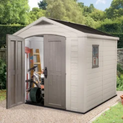 La structure en aluminium procure à la construction une grande stabilité. Une fixation au sol est nécessaire, un emplacement dédié à cet ancrage est présent sur l’abri (vis et chevilles non fournies). Le plancher antidérapant isole votre outillage de l’humidité ascendante, et des grilles d’aération situées sur les pignons permettent une circulation optimale de l’air.