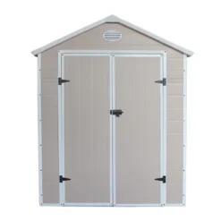Le coloris beige des panneaux s’intègre harmonieusement dans tout type d’aménagement extérieur, et les bandes blanches des raccords ou entourant la porte offrent un contraste élégant. Située au dessus de la double porte, une grille de ventilation assure un renouvellement de l’air par convection, pour une protection optimale de votre outillage. Sur le côté, une fenêtre fixe en polycarbonate apporte un éclairage naturel pendant la journée, vous dispensant d’amener un éclairage électrique. Cet abri est certifié CE, REACH et RoHS et dispose d’une garantie de 10 ans.