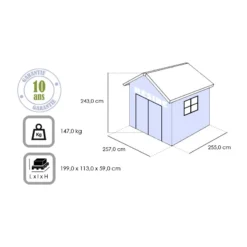 Construit en polypropylène traité anti-UV, l’abri de jardin Sydney se targue d’une durabilité et d’une résistance accrues aux conditions extérieures variables. Le plancher et les renforts métalliques inclus contribueront à sa stabilité au sol. L’abri en résine Sydney ne nécessite aucun entretien spécifique et, est garanti 10 ans ce qui prouve sa grande qualité.