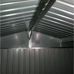 L’accès à l’abri se fait par une porte coulissante de 82cm de passage pour 154cm de hauteur. Le panneau composant le pignon avant de l’abri est découpé pour fournir une ventilation naturelle de l’air, évitant un excès d’humidité. Les parois ont une hauteur de 154cm à la jonction avec la toiture, et la hauteur faîtière est de 190cm, suffisante pour un accès confortable dans la partie centrale de l’abri.