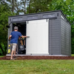Pour un gain de place maximal, l’abri de jardin en polyéthylène 7,30m² Modern est équipé d’une porte coulissante de type industrielle. Cadenassable (cadenas non fourni) et épaisse de 35mm elle offre un accès facile et met votre contenu en toute sécurité.