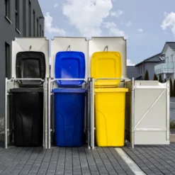 Ce modèle est prévu pour une utilisation en extérieur, il ne craint pas les intempéries et ne demande aucun entretien spécifique. Chaque compartiment est muni d’un portillon ouvrable sur la face avant et d’un couvercle avec crochet et cordelette pour une ouverture automatique de votre conteneur à déchets.