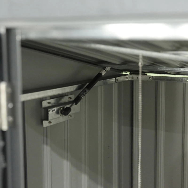 Lâouverture peut sâeffectuer par une large double porte (150x127cm) situĂ© sur la face avant pour sortir la poubelle ou en soulevant le couvercle pour une utilisation rĂ©guliĂšre. Lâouverture du couvercle est facilitĂ©e par un vĂ©rin, et elle provoque lâouverture automatique du couvercle de la poubelle au moyen dâune chainette avec crochet. La toiture monopente est dotĂ©e dâune pente accentuĂ©e pour faciliter un Ă©coulement optimal de lâeau de pluie et une Ă©vacuation naturelle de lâamas de neige. Elle peut supporter une charge de neige maximale de 100kg/mÂČ.
