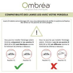 Les lames LED Ombrea sont compatibles avec toutes les pergolas bioclimatiques 3x3m, 3x4m, 3x6m, 3×3,6m et 3×5,3m de la marque Ombrea (si celle-ci a été achetée après mai 2021, sinon une vérification s’impose – détails dans les fichiers en téléchargement ci-dessous)