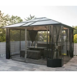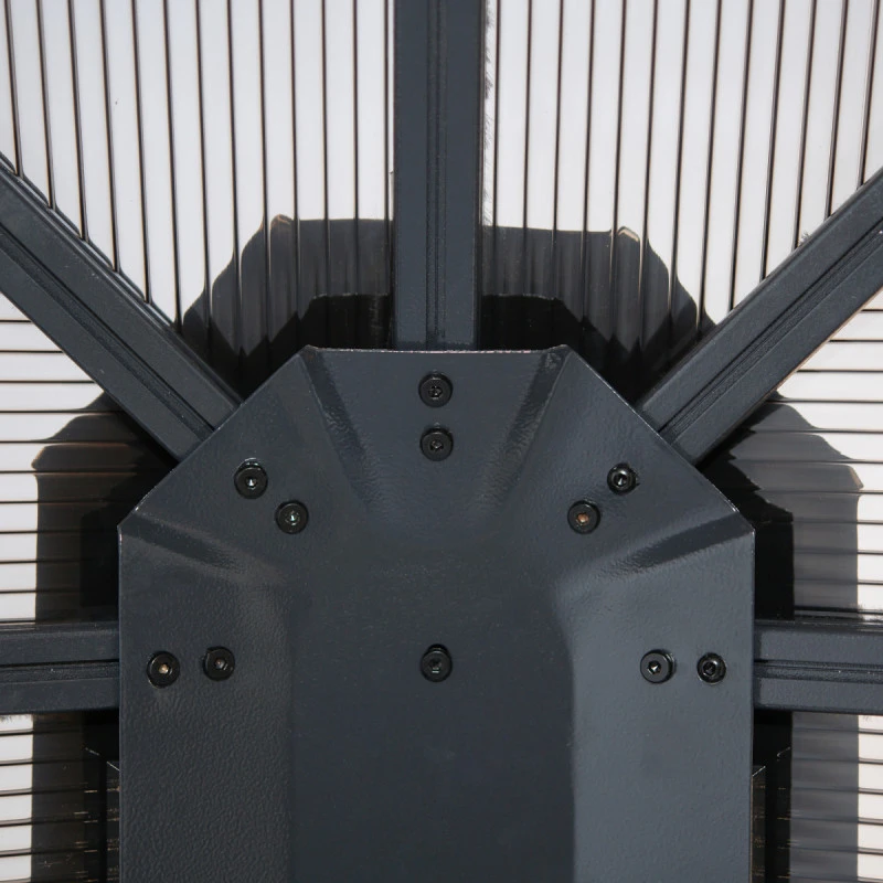 La toiture est constituĂ©e de panneaux solides en polycarbonate Ă doubles parois de 8mm dâĂ©paisseur teintĂ©s gris. Ces panneaux rĂ©sistent au rayonnement UV et sont parfaitement hermĂ©tiques. Ils sont conçus pour supporter une charge de neige de 125kg/mÂČ ce qui vous dispensera de dĂ©monter le gazebo pendant la saison hivernale. Lâinstallation est aisĂ©e, avec un outillage basique, et se rĂ©alise Ă deux personnes en environ 4 Ă 5 heures sur sol plat.