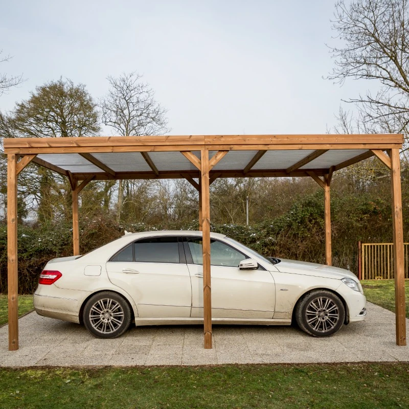 Elle est constituée de 6 poteaux de section 7x8cm soutenant une structure de chevrons espacés de 82cm, sur laquelle est fixée une couverture de plaques ondulées transparentes en PVC.
